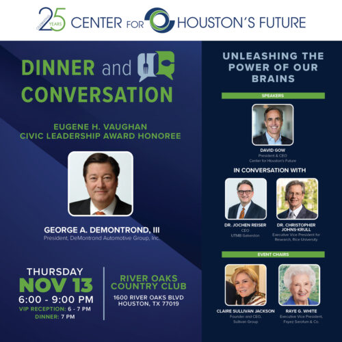 Center for Houston’s Future President & CEO David Gow will lead a dynamic conversation titled “Unleashing the Power of Our Brains” with distinguished speakers Dr. Jochen Reiser, CEO of UTMB Galveston, and Dr. Christopher Johns-Krull, Executive Vice President for Research at Rice University.